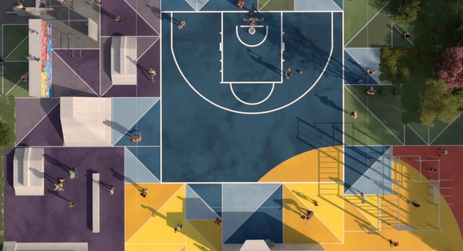 La struttura sarà concepita come una vera agorà contemporanea, capace di trasformarsi durante il giorno e l’anno: campo sportivo, area eventi, spazio di gioco e piazza d’incontro. La progettazione segue un sistema modulare basato su una griglia geometrica che permette flessibilità e uniformità estetica, mentre la scelta dei colori risponderà alla necessità di integrarsi con il parco urbano circostante.
